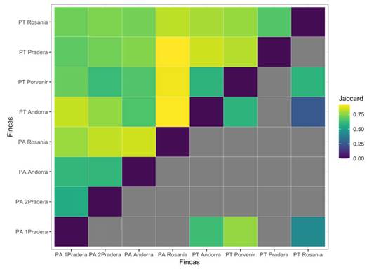 El índice de disimilitud de Jaccard fue más alto en las comparaciones del sitio PA_Rosania con los potreros tradicionales de PT_Pradera, PT_Andorra y PT_Porvenir (Figura 4). Esto indica que hay un mayor recambio entre estos sitios. Sin embargo, PA_Rosania presentó un recambio de especies considerable con relación a los potreros arbolados, como PA_2Pradera y PA_Andorra. Esta disimilitud ocurrió también en fincas de potreros tradicionales, como la comparación de las fincas Pradera y Andorra. La comunidad de anuros tuvo muy pocas detecciones para poder hacer comparaciones adecuadas en el recambio de especies, pero los valores de mayor disimilitud estuvieron entre PT_Porvenir y PA_1Pradera. Al contrario, la comparación pareada con menor recambio estuvo entre PT_Andorra y PT_Rosania.