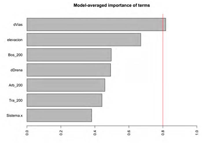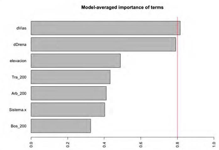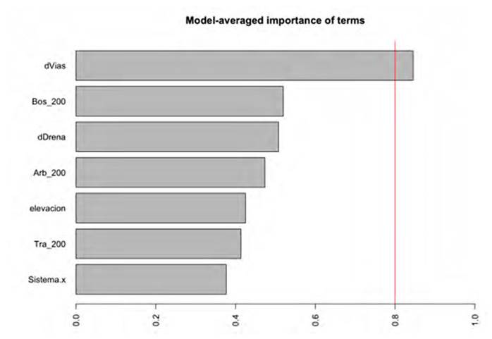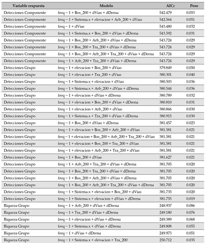Covariables ambientales. Para evaluar el efecto en el paisaje sonoro, se definieron covariables ambientales a partir de la imágen del satélite Sentinel-2 del 25 de diciembre de 2018 (Dymond et al., 2002; Samarawickrama et al., 2017), que permite una resolución entre 10 y 20 m (Vrieling et al., 2018). Se calculó el porcentaje de bosque natural (incluso secundario), potrero arbolado y potrero tradicional en radios de 50, 100 y 200 m (Información Suplementaria y Tabla S1). Aunque las variables de porcentaje de bosque natural, potrero arbolado y potrero tradicional a diferentes radios estuvieron altamente correlacionadas, para las comparaciones se usaron solo los valores a un radio de 200 m. Así mismo, se estimaron las distancias a vías y quebradas. Estas covariables ambientales fueron usadas para una escogencia múltiple de modelos lineales generalizados que pudieran explicar las variables respuesta, para lo cual fueron estandarizadas (i.e., reescalonadas para tener como promedio 0). Se usó la función glmulti del paquete glmulti para generar automáticamente todos los posibles modelos. Para determinar el modelo más factible o mejor ajustado se usó el criterio de información de Akaike (AICc), considerando un ΔAICc < 2 para los modelos más robustos (Burnham & Anderson, 2004).