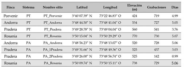 Toma de datos. Entre el 9 y el 27 de noviembre de 2019 se instalaron grabadoras en sistemas silvopastoriles de árboles dispersos de falso yopo (M. trianae) y en sistemas de ganadería tradicional. Usamos sistemas de grabación pasiva ARBIMON de Sieve Analytics, por medio de la aplicación ARBIMON Touch para Android, instalada en teléfonos celulares marca Motorola MotoG1, los cuales se instalaron dentro de una caja plástica (Grace Digital Eco Pod) que protegía el dispositivo de la lluvia. Cada celular se conectó a un micrófono (Monoprice) que permitía ampliar el rango de grabación de los teléfonos celulares (Herrera-Montes, 2018). Los teléfonos se programaron con la aplicación para grabar a una frecuencia de 44.1 kHz con 16 bits de resolución durante 1 minuto, a intervalos de 10 minutos por un promedio de 4 días en cada lugar (Tabla 1), generando grabaciones con formato no comprimido WAV. Las grabadoras se instalaron manteniendo una distancia mínima de 200 metros, a una altura de 1.50 metros del suelo y aseguradas con cuerdas a un tronco de árbol, con el micrófono dirigido hacia abajo (Herrera-Montes, 2018).