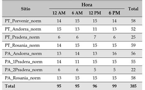 Composición del paisaje sonoro y actividad acústica de aves y anuros. Se revisaron 15 grabaciones por hora, por día, por sitio aleatoriamente en las franjas de horas 06:00-07:00, 12:00-13:00, 18:00-19:00 y 00:00-01:00 con el fin de identificar los principales componentes del paisaje sonoro. En el caso de la finca La Pradera, tanto para potreros arbolados como para potrero tradicional, solamente se encontraron 6 archivos para el periodo de muestreo, al parecer debido a un fallo con la grabadora, así que revisamos el total de archivos en estos sitios (Tabla 2). Se anotó la presencia y ausencia de componentes del paisaje sonoro usando la herramienta en ARBIMON II “Composición de paisaje sonoro”; se seleccionaron, para cada grabación revisada, presencia de geofonía (viento, lluvia, movimiento de agua), biofonía (aves, anfibios, insectos, mamíferos, domésticos) y antropofonía (vehículos terrestres, vehículos aéreos, maquinaria, voces, sonidos eléctricos).