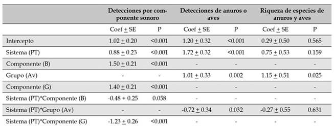 Para determinar las diferencias en la composición del paisaje sonoro entre los sistemas tradicionales y arbolados, se realizó un conteo de los dos grupos taxonómicos seleccionados (anuros y aves) y se estimó la riqueza de especies. Posteriormente, se realizó un modelo lineal generalizado que vinculaba la variable respuesta (conteo y riqueza de especies) con los factores fijos de sistema (tradicional o arbolado), componente (geofonía, biofonía, antropofonía) y grupo taxonómico (anuros y aves), así como sus interacciones. Cada modelo lineal generalizado fue vinculado con la función de enlace Poisson. Para determinar los tipos diferentes se realizó una prueba post-hoc de comparación múltiple de Tukey. Por su parte, se comparó la composición de especies entre los sitios con sistema tradicional o arbolado con el índice de disimilitud de Jaccard (Jaccard, 1912) . Entre más altos los valores del índice de Jaccard, más alto el recambio o mayor disimilitud entre los sitios.