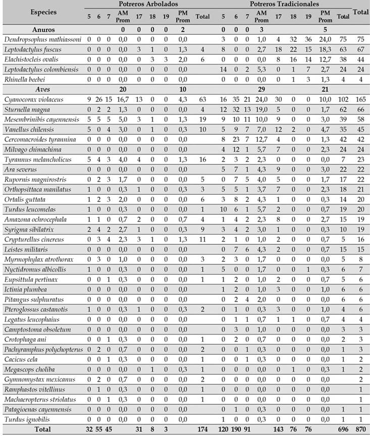 Al revisar la lista de especies detectadas, se resalta la poca diversidad total reportada en potreros arbolados, con 2 especies de anuros y 23 especies de aves (Tabla 4, ver datos extendidos en Tabla S3). Por su parte, los potreros tradicionales registraron 5 especies de anuros y 30 especies de aves. La especie de anuro con más detecciones fue Dendropsophus mathiassoni, únicamente registrado en potreros tradicionales, principalmente al atardecer, seguido por Leptodactylus fuscus presente en ambos sistemas, pero con muchas más detecciones (59) en potrero tradicional. El ave con mayor número de detecciones fue Cyanocorax violaceus, seguido por Sturnella magna y Mesembrinibis cayennensis, registrados en ambos sistemas, pero mayoritariamente en potreros tradicionales. Este patrón se mantuvo para casi todas las especies, excepto Tyrannus melancholicus, Crypturellus cinereus, Pachyramphus polychopterus, Gymnomystax mexicanus, Ramphastos vitellinus y Machaeropterus striolatus (Tabla 4), que tuvieron más detecciones en potreros arbolados que en tradicionales.