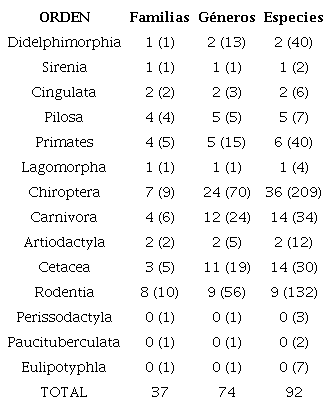 Los quirópteros se sitúan como el orden más diverso con 36 especies (39.1 %), seguido de Cetacea y Carnivora con 14 especies cada uno (15.2 %; Tabla 1). Las familias con mayor riqueza corresponden a Phyllostomidae (Chiroptera) y Delphinidae (Cetacea) con 18 y 8 especies respectivamente.
