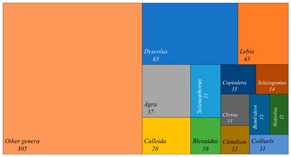 Based on published data, the family Carabidae is currently represented in Colombia by 625 species -close to 1.7 % of the world total-, arranged in 10 subfamilies, 32 tribes and 125 genera (Appendix 2). Of the recorded species, 330 (53 %) have not been reported from any other country, so that could be considered Colombian endemics, at least until they do not get recorded from any surrounding country. Thirteen genera account for 50 % of the species, the most speciose genus being DyscolusDejean, 1831 (Harpalinae, Platynini), which contains 14 % of the total (85 species) (Figure 1). Forty-seven genera (38 %) are represented by a single species in Colombia (Table 1), five of which are monospecific, with records of their unique species in at least another country: Stenocheila (Harpalinae, Lachnophorini); Askalaphium (Harpalinae, Ctenodactylini); Enceladus (Siagoninae, Siagonini); Homalomorpha (Harpalinae, Cratocerini) and Trichognatha (Harpalinae, Galeritini) (Martínez 2003, 2005; Martínez & Ball, 2003; Lorenz, 2017). Three genera are only known from Colombia: Callidadelpha (Harpalinae, Lebiini), Cryptomma (Scaritinae, Clivinini) (without specific locality recorded) and Columbitrechus (the latter, most likely a synonym of Paratrechus). Finally, two introduced species have been registered: Laemostenus complanatus, from northern Africa and/or western Europe (Martínez, 2005), and Mochtherus tetraspilotus, from southeastern Asia (Torres-Domínguez et al., 2020).