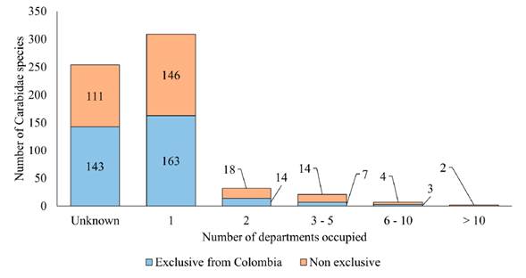 Regarding species geographic distribution, 254 species (~41 %) are known from the country as a whole without more precise localities, from which 143 have not been cited from any other country; 371 species (~59 %) have at least one specific locality record. 309 species are known from a single department (Figure 4), and 163 of these are exclusive to Colombia. The departments with the highest number of recorded species are: Magdalena (79), Cundinamarca (75) and Valle del Cauca (43), while Guaviare, San Andrés y Providencia and Sucre have no records for the family (Appendix 1, Figures 2 and 3).