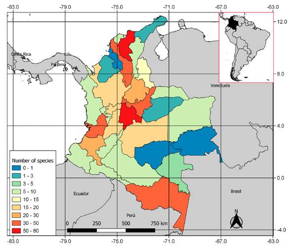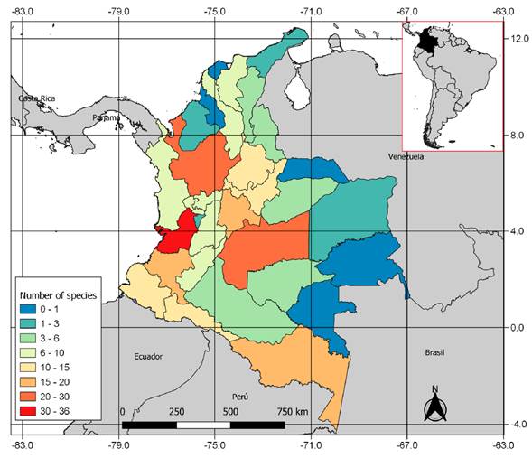 The checklist was used as a database to build graphs and maps to better understand the current state of knowledge of the group in Colombia. These graphs are based on the description year or on the year of the first record for each species, on the number of species per genus, and on the number of species per department.