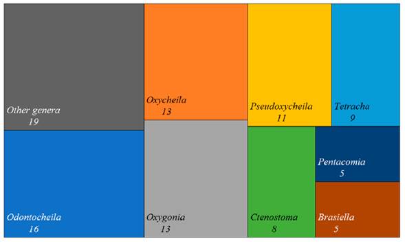 The family Cicindelidae is currently represented in Colombia by 100 species distributed in three tribes and 21 genera of the subfamily Cicindelinae (Appendix 3). This figure represents 3.3 % of the world total of tiger beetle species, a percentage twice as high as in Carabidae. Of the species registered in the Colombian territory, 16 do not have records in any other country, most of them probably endemic according to the available data. The most diverse genus is Odontocheila, with 16 species, while 81 % of the remaining species is contained in seven different genera (Figure 4).