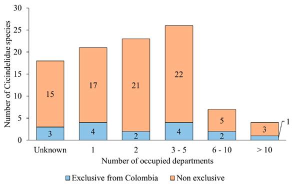 Regarding the distribution of Cicindelidae in Colombia, 17 species (17 %) do not have any precise locality records, three of which appear to be endemic to the country: Odontocheila simulator, although the holotype and only known specimen of this dubious taxon is probably an artefact (Moravec, 2018); Pseudoxycheila ceratoma; and Pseudoxycheila tarsalis (Cicindelini). 21 species are known from only one department (Figure 5), and of these, four are not recorded from other countries: Odontocheila hamulipenis and Oxycheila pseudoaquatica (Cicindelini) from Valle del Cauca; Oxygonia kippenhani from Boyacá; and Ctenostoma (Procephalus) maculosum (Ctenostomatini) from Cundinamarca (Appendix 3).