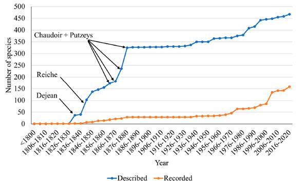 The current knowledge of the families Carabidae and Cicindelidae in Colombia is the result of a two centuries-long history (Figure 7).Regarding Carabidae, taxonomic descriptions based on material from Colombia began as early as 1825,but they reached their greatest development between the second third and the end of the 19th century, a period in which 70 % of the carabid fauna known from the country had already been described, mainly thanks to the contributions of Louis Reiche (52 species described- between 1842 and 1843), Maximilien de Chaudoir (131 species described between 1848 and 1880) and Jules Putzeys (89 species described between 1846 and 1878). In this period, most descriptions were very brief, not illustrated, with limited distribution data or without any, and they did not fit the current standards of insect taxonomy. Furthermore, very few have been subject to taxonomic revisions in recent times, which makes their identification difficult, if not impossible without examining type specimens.