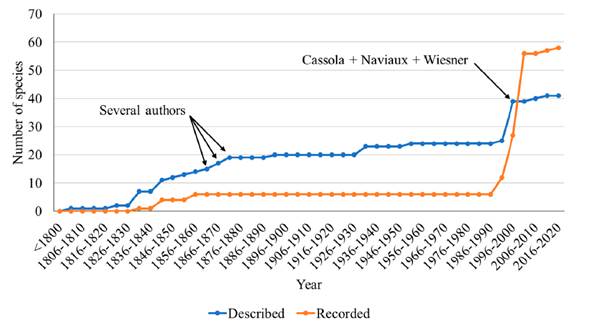 The investigations on Cicindelidae followed a different path (Figure 8). The pace of descriptions was globally slow, with two acceleration points: a weak one during the second third of the 19th century, with contributions by several authors who published isolated species descriptions, and another very strong in the last decade of the twentieth century, based on more comprehensive works, especially revisions of genera at a continent scale, such as those by Fabio Cassola (1997), Roger Naviaux (1998), Jürgen Wiesner (1992), 1999). Thanks to these taxonomic revisions and to several local, national or continental checklists (Cassola & Pearson, 2001; Fernández et al., 1993; Moravec 2018, 2020; Vítolo & Pearson, 2003; Wiesner, 2020), Colombian records of species described from other countries increased dramatically since 1990, exceeding the number of new descriptions. In this regard, tiger beetle knowledge has progressed much faster in recent decades than that of ground beetles. This greater sampling and publication effort may also explain why the Colombian records amount to 3.3 % of the world total of tiger beetle species, a percentage twice as high as in Carabidae.