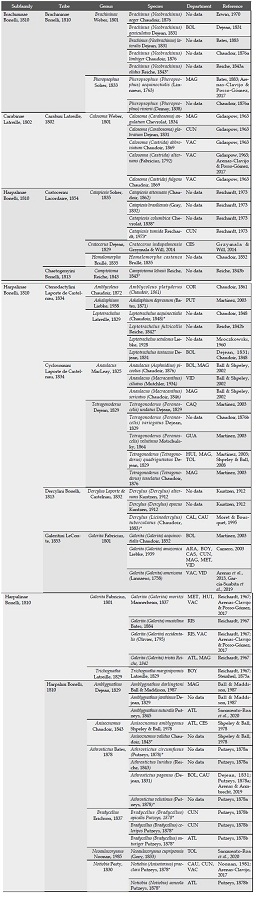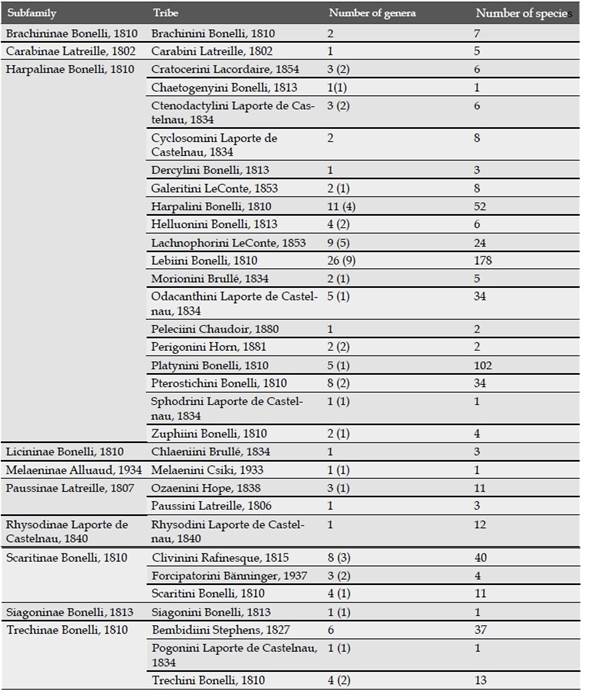 The knowledge of Colombian Geadephaga has increased in recent years, due to a growing number of taxonomic (e.g. Arenas-Clavijo, 2017; Forero et al., 2019; Moret, 2019; Sarmiento-Roa et al., 2020) and ecological studies (e.g. Arenas & Armbrecht, 2019; García-Suabita et al., 2019) based on this group during the last decade. An update of the current taxonomic and faunistic knowledge was therefore necessary, as a starting point for future systematic revisions of the tribes or genera which might deserve special attention from a biogeographical or ecological point of view.