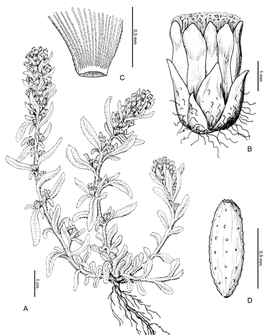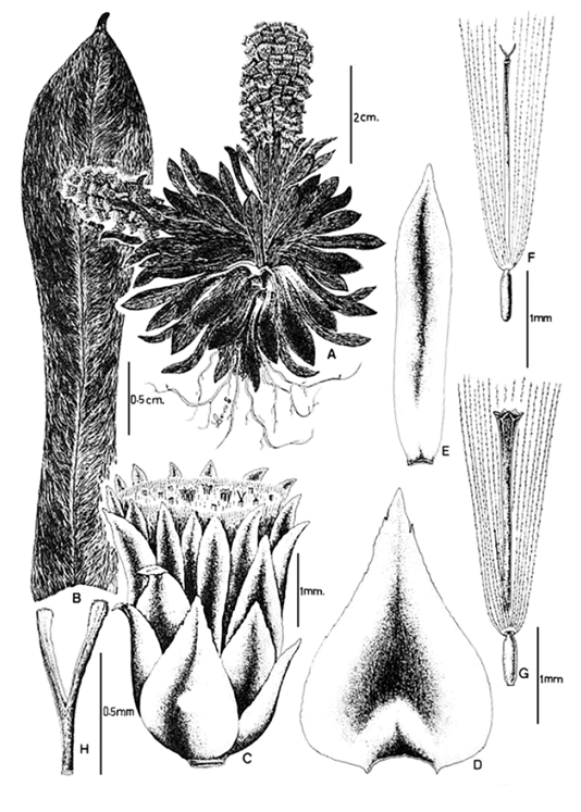 Hierbas perennes, cespitosas o subcespitosas, hasta de 12 cm de alto; tallos postrados o ascendentes, ramificados y densamente hojosos en la base, laxamente en la parte superior, blanco-tomentosos. Hojas basales arrosetadas, obovadas o linear-obovadas, 4-22 × 1.5-4 mm, atenuadas en la base, obtusas a redondeadas en el ápice, apenas discoloras o discoloras, blanco-lanuginosas en la haz, blancuzco-lanosas en el envés; hojas caulinares linear-obovadas, 5-20 × 2-5 mm, agudas. Sinflorescencias en pseudoespigas discontinuas, alargadas; involucro acampanado, 4-4.5 × 3.5-4 mm; filarios dispuestos en 3-4 series, los externos ovados, 1.5-2.2 × 0.5-1 mm, agudos, lanuginosos, los internos oblongo-obovados, 2.8-3 × 0.4-1 mm, agudos, subglabros. Flores marginales 35-40, pistiladas, corolas filiformes, ca. 2 mm de longitud; flores centrales ca. 3, bisexuales, corolas tubulosas, ca. 2 mm de longitud. Aquenios oblongo-elipsoides, 0.5-0.7 mm de longitud, provistos de tricomas cortos y globosos. Vilano ca. 2 mm de longitud, formado por numerosos pelos escabrosos, blancos, unidos en la base.