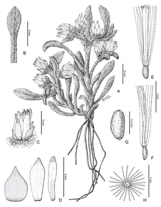 Nota. Gamochaeta subfalcata es similar a G. filaginea, esta última especie reportada como dudosa para el país (Luteyn, 1999), puesto que ambas especies son hierbas multicaules con tallos ascendentes y hojas obovadas o linear-obovadas, concoloras. La diferencia entre ambas especies está en los filarios internos, que son obtusos en G. subfalcata (vs. filarios internos agudos en G. filaginea).