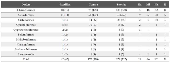 Family. Acestrorhynchidae, Achiridae, Anostomidae, Apteronotidae, Aspredinidae, Astroblepidae, Auchenipteridae, Belonidae, Bryconidae, Callichthyidae, Cetopsidae, Chalceidae, Characidae, Chilodontidae, Cichlidae, Crenuchidae, Ctenoluciidae, Curimatidae, Doradidae, Erythrinidae, Gasteropelecidae, Gymnotidae, Hemiodontidae, Heptapteridae, Hypopomidae, Iguanodectidae, Lebiasinidae, Loricariidae, Parodontidae, Pimelodidae, Poeciliidae, Potamotrygonidae, Prochilodontidae, Pseudopimelodidae, Rhamphichthyidae, Rivulidae, Sciaenidae, Serrasalmidae, Sternopygidae, Synbranchidae, Trichomycteridae, Triportheidae.