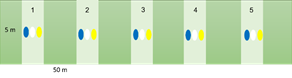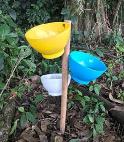 Se hicieron, en total, 18 muestreos de abejas (dos por sitio). En cada sitio (Tabla 1) se pusieron cinco trampas separadas por 50 m entre sí. Es decir, se cubrió una longitud de 500 m por sitio. Cada trampa (pan trap) constó de tres platos plásticos de 500 ml, de colores llamativos para las abejas (azul, blanco y amarillo), para un total de 15 platos por sitio (Figura 2). Los tres platos se elevaron a 0,5 m del suelo con ayuda de un palo de madera (Figura 3), se llenaron con una solución atrayente de agua con miel de abejas comercial en proporción 4:1 y jabón, para romper la tensión superficial del agua, y se dejaron por 6 horas, entre las 9:00 y las 15:00, para un total de 12 horas por sitio y 108 horas en los nueve sitios. Adicionalmente, en el espacio que separaba cada trampa (cinco transectos de 50 x 5 m) se asperjó la misma solución de miel de abejas sobre las plantas herbáceas y arbustos, mientras dos personas observaron y capturaron abejas con una red entomológica (37 cm de diámetro), tanto al vuelo como en las flores. Las capturas se realizaron durante 15 minutos/persona/transecto en dos periodos del día, entre las 10:00 y las 11:30 y entre las 14:00 y 15:30, para un total de 10 horas por sitio en los dos muestreos y 90 horas en los nueve sitios. Se registraron datos de fecha, hora de captura, localidad y especie de planta visitada por las abejas recolectadas.