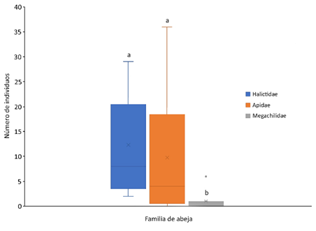 Se encontraron 208 individuos de abejas pertenecientes a 3 familias, 12 tribus, 22 géneros y 38 especies (Figura 4). Se encontraron 3 de las 5 familias de abejas reportadas en Colombia: Halictidae, Apidae y Megachilidae, siendo la primera la que presentó la mayor abundancia (53 %) y riqueza de especies (18), seguida por Apidae (43 %) con 14 especies y Megachilidae (4 %) con 6 especies. La familia Halictidae estuvo presente en todas las áreas naturales, Apidae tuvo la mayor variación en número de individuos por sitio y Megachilidae estuvo poco representada. La abundancia entre Halictidae y Apidae con respecto a Megachilidae fue significativamente diferente (Kruskal-Wallis, H = 10,31; p = 0,005; Mann-Whitney post Kruskal-Wallis, p = 0,0013) (Figura 4).