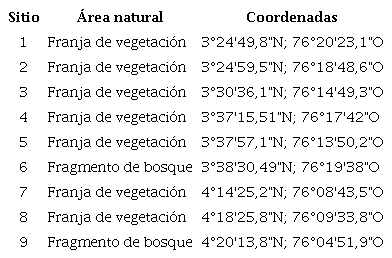 La investigación se llevó a cabo entre marzo de 2021 y febrero de 2022 en nueve áreas naturales presentes en el agropaisaje de caña de azúcar en el valle del río Cauca (Valle del Cauca, Colombia). Estas áreas naturales están representadas por dos fragmentos de BST (El Hatico y El Medio) y siete franjas de vegetación o franjas protectoras de cuerpos de agua, compuestas por un conjunto de vegetación arbórea, arbustiva y herbácea ubicadas en las riberas de ríos, zanjones o madreviejas; todas localizadas junto a lotes con cultivos de caña de azúcar (< 5 m). Las franjas de vegetación ribereñas tienen una longitud de entre 6 y 54 m, y bordean cuerpos de agua como ríos, quebradas, zanjones o madreviejas. El fragmento de bosque de El Hatico tiene un área de 9 ha y el de El Medio de 13 ha. Se seleccionaron áreas naturales localizadas a lo largo del valle del río Cauca desde el municipio de Zarzal hasta el municipio de Candelaria.