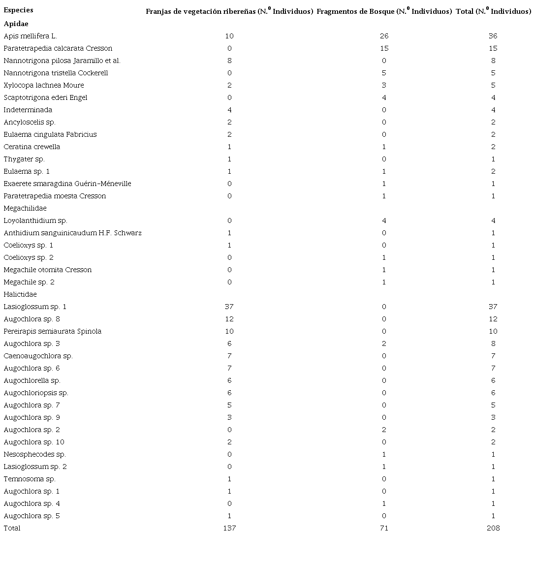 Respecto a la composición de especies, se encontró mayor riqueza de especies de las familias Apidae y Megachilidae en los fragmentos de bosque, mientras que en las franjas de vegetación la mayor riqueza la presentó la familia Halictidae (Tabla 2). Los fragmentos de bosque presentaron 13 especies exclusivas: cinco de la familia Apidae, cuatro de la familia Megachilidae y cuatro de la familia Halictidae. Por su parte, las franjas de vegetación ribereñas presentaron 20 especies exclusivas: cinco pertenecientes a la familia Apidae, dos especies de la familia Megachilidae y 13 especies de la familia Halictidae.