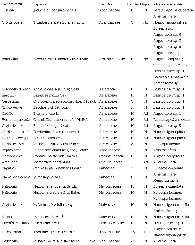 Las abejas sociales A. mellifera, Nannotrigona tristella Cockerell y N. pilosa se catalogaron como generalistas, pues visitaron especies de distintas familias, a diferencia de otras abejas, como Paratetrapedia calcarata, que visitó exclusivamente la herbácea Justicia cf. carthagenensis (Figura 5).