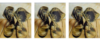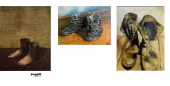 La primera serie de transición se compone de tres imágenes iguales, elaboradas con una técnica de óleo en la que predominan colores cafés y ocres. La imagen se encuentra en una perspectiva frontal que ocupa casi el 90 % del recuadro, sobre un piso de madera en el que se aprecian dos líneas a los lados de las botas, que marcan los límites entre las tablas de madera. La relación figura fondo está dada por los cambios de color, ya que en la mitad, el límite entre el piso de madera y la pared posterior se establece por el cambio entre el café de la madera y el color gris con breves trazos de café de la pared. El contraste claro oscuro se ve en el café oscuro en el interior de las botas y los tonos con algunos visos de luces marcados en el piso, en la parte anterior de las botas y la pared.