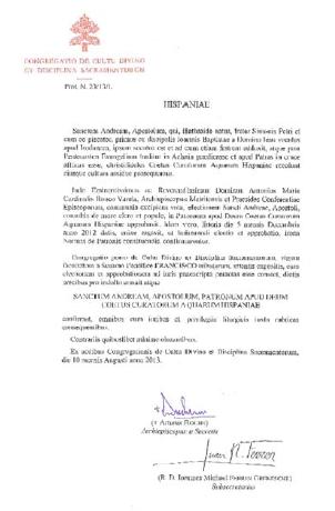 Además el Eminentísimo y Reverendísimo Señor Cardenal Antonio María Rouco Varela, Arzobispo de Madrid y Presidente de la Conferencia Episcopal Española, junto con los votos de la reunión de obispos y consultado el pueblo y el clero, aprobó la elección de San Andrés, Apóstol, como patrón ante Dios de los Acuicultores Españoles. En la carta de 2 de diciembre de 2012, rogaba con insistencia, que fueran confirmadas su elección y aprobación, al cumplir las Normas de los Patronos. La Congregación para el Culto y la Disciplina de los Sacramentos, que tiene esta facultad concedida por el Sumo Pontífice Francisco, con la elección y aprobación prescrita por el derecho y cumplidas las prescripciones previstas, dadas las normas para la indulgencia anual confirma que