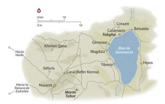 Comenzaremos dando unos datos básicos del lugar del milagro. El lago de Galilea, también llamado lago de Genesaret, Tiberíades o Kineret (Figura 1); es la principal masa de agua dulce del norte de Israel y es considerado como subtropical. El lago está a -210 m bajo el nivel del mar siendo el lago más bajo de la tierra. Tiene una forma aproximadamente elíptica y mide 21 km en la zona más ancha en dirección norte-sur y 12 km en la este-oeste. Su profundidad es variable y llega hasta 42 m de máxima. Lo atraviesa el río Jordán de norte a sur. El clima es mediterráneo semiárido con 380 mm de lluvia/año de media. La temperatura del agua oscila entre los 15 y 30 ºC y su salinidad es de 0,27 g/l (Ostrovsky y cols., 2013). Las condiciones del lago son muy beneficiosas para tener una alta producción pesquera y desde la antigüedad hasta hoy ha tenido una explotación pesquera constante y numerosos puertos en sus orillas (Ben-Tuvia, 1978; Nun, 1989; González Echegaray, 1994 y 2000). Además, su entorno es adecuado para la agricultura (Lofendel y Frenkel, 2007).