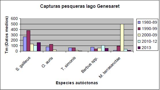 Además, es seguro que los judíos no comerían especies presentes en el lago, pero que son consideradas impuras por el Antiguo Testamento (Levítico 11, 9-12), como son anguilas y silúridos, pues no tienen escamas (propiamente hablando las escamas de las anguilas son microscópicas). Si descartamos las especies sin interés pesquero quedan 6 especies que son: Sarotherodon galilaeus (Linnaeus, 1758); Oreochromis aureus (Steindachner, 1864); Tristramella simonis simonis (Günther, 1864); Barbus longiceps (Valenciennes, 1842) y Carasobarbus canis (Valenciennes, 1842), agrupados en la gráfica como Barbus spp.); y Mirogrex terraesanctae (Steinitz, 1952) (Figura 3).