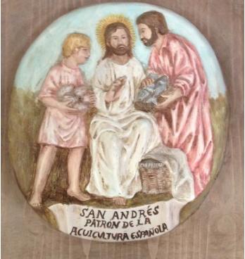 La elección de san Andrés como patrón de la acuicultura española por la SEA, que se celebra el 30 de noviembre, y su celebración como Día de la Acuicultura responde al milagro de la primera multiplicación de los panes y de los peces hecha por Jesucristo, a instancias de san Andrés, en el año 29 de nuestra era. Este milagro está relatado en los cuatro Evangelios del Nuevo Testamento, lo que ya es motivo de credibilidad, pues se trata de un documento con valor histórico (Balaguer y cols., 2005). La SEA ha realizado una imagen para los establecimientos acuícolas que lo deseen (Figura 5).