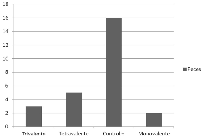 En la actualidad, se considera que la manera más eficaz de proteger frente a la lactococosis en peces es a través del uso de vacunas. Esto es debido al importante coste económico que conlleva el uso de antibióticos, las posibles resistencias que se puedan llegar a desarrollar frente a los mismos, así como las barreras legales o la imposibilidad de su administración vía oral a causa de la anorexia derivada de la enfermedad. Es por ello que se hace necesaria la prevención mediante inmunoprofilácticos (Vendrell y cols., 2006) y que la formulación de éstos, además de la pauta vacunal utilizada, sean lo más eficaces posibles. En el presente estudio, los resultados de protección frente a L. garvieae mediante reto por cohabitación que proporcionaron la vacuna monovalente, la vacuna trivalente y la vacuna tetravalente fue respectivamente del 87,50%, 81,25% y del 70,93%, pudiendo concluir que la vacunación con cualquiera de las tres genera un nivel de inmunidad más que aceptable frente a la bacteria. El hecho de que algunos procesos inmunológicos tales como las reacciones cruzadas, la competición entre los distintos antígenos o la concentración de cada antígeno que podemos inocular a través de una vacuna polivalente pueden afectar severamente la actividad de los anticuerpos (Nikoskelainen y cols., 2007), concuerda con que la vacuna con mayor efectividad fuera la monovalente. No obstante, se han formulado vacunas polivalentes que inducen una buena estimulación del sistema inmune en salmónidos, en algunos casos incluso más que las monovalentes (Hoel y cols., 1997; Nikoskelainen y cols., 2007).