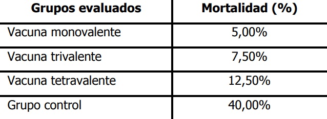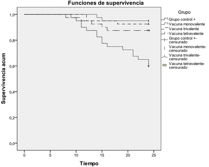 Se aplicó el estimador de supervivencia de Kaplan-Meier (Fig. 3) para verificar si existían diferencias significativas entre cada una de las tres vacunas con el control positivo, siendo significativo en los tres casos (p<0,05).