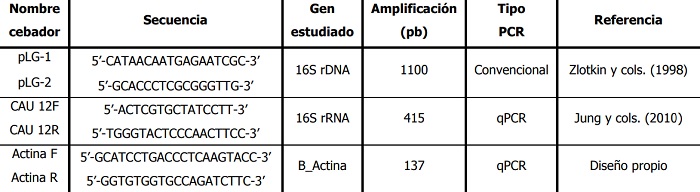 Para la detección de L. garvieae, se utilizaron dos técnicas moleculares basadas en el mismo principio, la técnica de PCR convencional previamente descrita por Zlotkin y cols. (1998) y la PCR a tiempo real descrita por Jung y cols. (2010). La primera técnica molecular se realizó con el fin de detectar cualitativamente muestras positivas mientras que con la qPCR, además de realizar una detección cualitativa, sirvió también para cuantificar relativamente la carga bacteriana de dicho patógeno en las muestras analizadas. El cálculo de las copias de ADN de L. garvieae se realizó mediante la fórmula 2-ΔΔCT (Livak y cols., 2001).