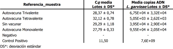 Por otra parte, se realizó una qPCR en los diferentes pools de los distintos experimentos. Los resultados obtenidos revelaron la presencia de ADN de L. garvieae en todas ellas como se observa en la Tabla 3. En la misma tabla, se pueden observar la media de los ciclos de cuantificación (Cq) de los dos pools analizados dentro de cada grupo, además de los controles negativos y positivos.