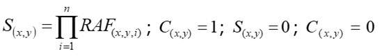 RAF(x,y,i) es el factor espacialmente variable modificado por su RAF en niveles de aptitud; i=1...n es un índice que identifica los parámetros de entrada correspondientes; y C(x, y) es la imagen de restricciones espacialmente variable. S(x,y) es un valor binario que puede ser 0 (no apto) o 1 (apto). Los RAF de la calidad del agua y disponibilidad de alimento se pueden obtener de la literatura científica sobre la fisiología y el crecimiento de moluscos cultivados.