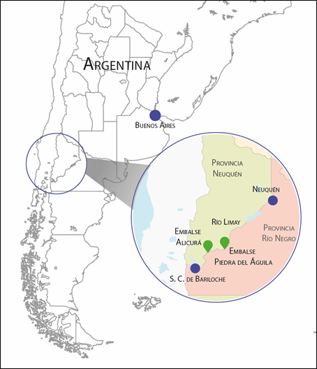 En Argentina, la producción acuícola se inició de forma extensiva en la década del ’80. En Patagonia Norte, específicamente, la actividad piscícola se vincula a la construcción de represas hidroeléctricas sobre el Río Limay (Figura 1), ya que representan el único sitio autorizado para el engorde de truchas arco iris (Oncorhynchus mykis). Desde mediados de los ’90, con la incorporación de tecnología que condujo a prácticas de carácter intensivo, se evidenció un gran crecimiento de la producción. Por esos años, las explotaciones piscícolas ubicadas en los embalses del Río Limay representaban casi el total de la producción acuícola nacional, que rondaba las 1.000 ton/año (Luchini y Panné-Huidobro, 2008; Wicki y Luchini, 2002). Durante los años 2000, se produjo una diversificación de las especies cultivadas en el país, lo cual se tradujo en un fuerte crecimiento del pacú, que superó así a la participación de la trucha en la producción argentina. En 2014, la producción acuícola nacional alcanzó su máximo de 4.000 toneladas/año. El pacú representó más de la mitad de dicho agregado, mientras que la trucha, con sus 1.400 ton/año, sólo dio cuenta de un 36% (Panné-Huidobro, 2014, 2015, 2016).