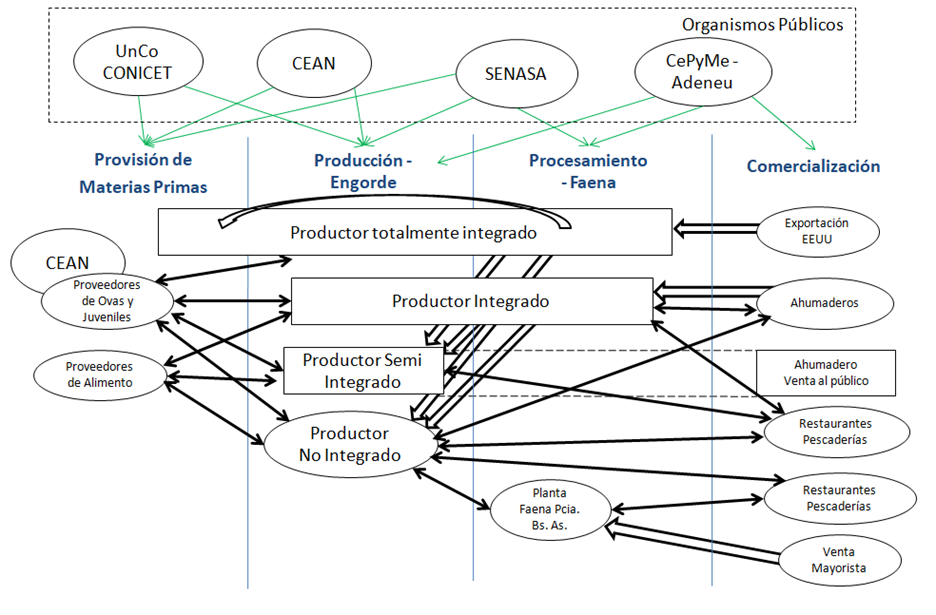 Otro aspecto de interés para el enfoque de CGV es el marco institucional (Figura 2), en el cual se considera a las instituciones y organizaciones que influyen de diversas maneras en el sector. Diversos grupos de la Universidad Nacional del Comahue (UNCO) y el CONICET, como así también del CEAN, realizan investigaciones y desarrollan nuevas tecnologías, generando no sólo conocimiento científico sino también capacitando y formando recursos humanos (la UNCO, por ejemplo, ofrece la Tecnicatura en Acuicultura). Las actividades de control son llevadas a cabo por SENASA y el CEAN, y se concentran principalmente en las etapas de engorde y procesamiento, con el objetivo de preservar las cualidades del medio ambiente y asegurar la calidad de los productos. También se debe mencionar al Centro PyME-ADENEU de la Provincia de Neuquén, que contribuye al desarrollo del sector por medio de la búsqueda de inversiones y el asesoramiento productivo y comercial. A su vez, participa en la gestión de la construcción de la (nueva) Planta de Proceso de Pescado de Piedra del Águila (sobre la que luego volveremos). Uno de los aspectos institucionales que sobresale es el acotado esfuerzo que se realiza (o la desatención) en materia de análisis y exploración de nuevas alternativas de comercialización, mientras que las energías tanto públicas como privadas se concentran mayoritariamente en las primeras etapas del proceso productivo.