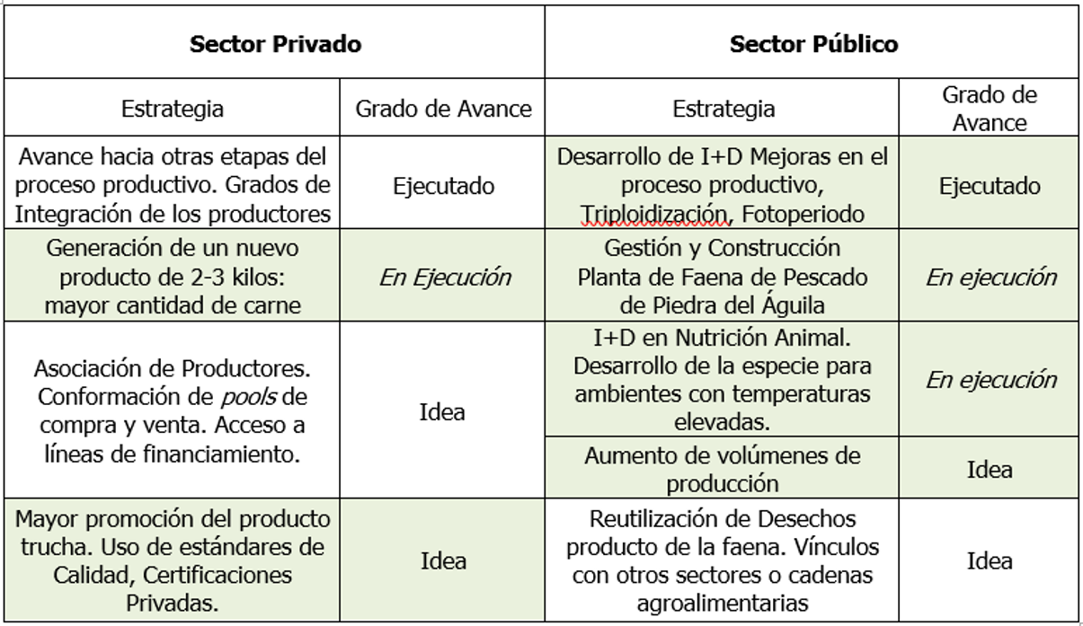Desde el sector público, las actividades de I+D que se realizan y luego se implementan en la producción, representan principalmente posibilidades de reposicionamiento para los productores a partir de mejoras en el proceso productivo y/o en el producto final. En los centros de investigación y universidades se han llevado adelante diversos avances tecnológicos en materia de ovas y juveniles de trucha arco iris que ya están siendo utilizados por los establecimientos piscícolas, como pueden ser la implementación de la metodología de fotoperiodo y el uso de truchas triploides, que permiten acelerar el proceso productivo y distribuir mejor las ventas a lo largo del año.