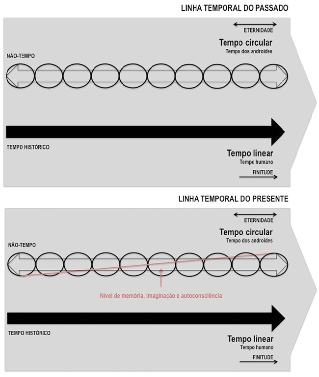 Na concepção temporal complexificada de Westworld (Figura 1) - com redobramento da linha temporal e do tempo interno -, a memória é marca distintiva das temporalidades. Se pensamos a memória como o que presentifica o passado, adotando a perspectiva agostiniana , a linha temporal do passado na série é a manifestação de uma memória maior: a da própria narrativa. Mas há ainda, num segundo plano, a ação da memória que distingue as temporalidades internas a cada linha temporal. No tempo linear, a memória é plena, portanto, trata-se do tempo histórico dos humanos; no circular, a memória está limitada ao looping que os androides vivenciam ou, numa perspectiva estendida, trata-se de um não-tempo, à medida que os loopings tendem à eternidade. É a lembrança de fatos, apenas na linha temporal do presente, para além do looping em que estão inseridas, que leva Dolores e Maeve a tomar crescente consciência de suas condições e a imaginar ações fora dos roteiros e além de suas limitadas capacidades de improvisação. Tal fato aponta para um possível rompimento nessa circularidade temporal para ambas as personagens em futuras temporadas.