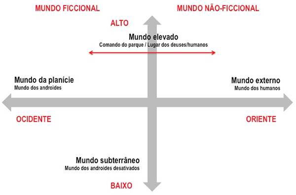 Assim, é no plano espacial que a imaginação representa suas ações contra o terror do tempo, que em Westworld, como vimos, apresenta-se de forma redobrada nas duplicações das linhas temporais (passado e presente) e nas formas temporais (linear e circular) que operam dentro de cada uma delas. Para fazer isso, a concepção espacial da narrativa estabelece quatro mundos numa topologia que remete aos quatro pontos cardeais, em função das oposições entre as características predominantes em cada um desses mundos.