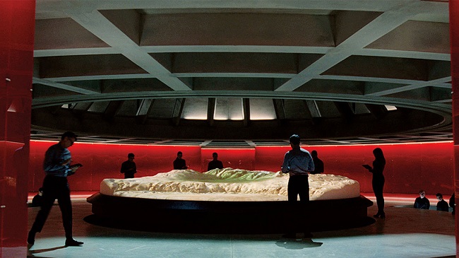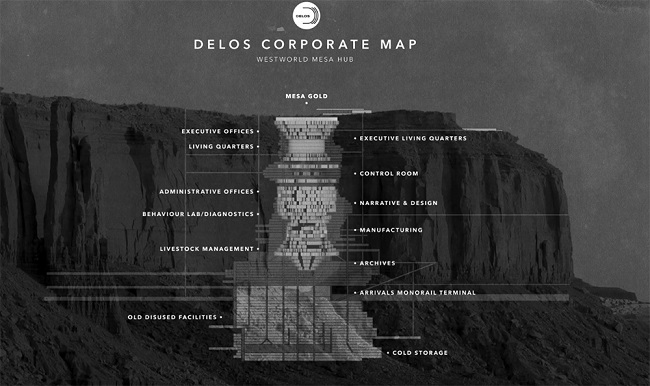 O mundo elevado é onde está a sede de comando do parque e a fábrica de androides. As imagens na série mostram que ele está localizado geograficamente em uma mesa (área elevada do solo com topo plano), que se ergue em uma região de planície e cânions, e é composto por vários andares. Sua estrutura (Figura 3) - revelada em um dos sites criados pela HBO para expandir o universo da narrativa, em sua estratégia transmídia - está inserida dentro do monte, indo do topo à base, com as salas dos executivos e de comando localizadas nos pontos mais altos da torre. O mundo elevado conecta o universo ficcional (do parque e androides) ao não-ficcional (mundo externo e dos humanos) e nele habitam aqueles que criam e definem o destino dos androides, considerados na mitologia que vigora no universo ficcional diegético da série como deuses e seres lendários. No mundo elevado, destaca-se o preenchimento do arquétipo do alto na concepção espacial de Westworld, remetendo ao mesmo tempo a referências sagradas, como o monte Olimpo, morada dos deuses gregos, e profanas, como os domínios e superioridade da ciência e da tecnologia sobre o mundo natural. É o lugar do apolíneo, da perfeição e da ordem. É onde estão os executivos (donos do mundo) e os cientistas (criadores do mundo). A frequente repetição de cenas com a imagem da maquete interativa que miniaturiza o parque com os administradores ao redor observando e interferindo no que lá acontece (Figura 4), num efeito de gigantização dos humanos em relação ao mundo que comandam, sintetiza os sentidos de superioridade, dominação, controle e separação entre criadores e criaturas associados ao mundo elevado.