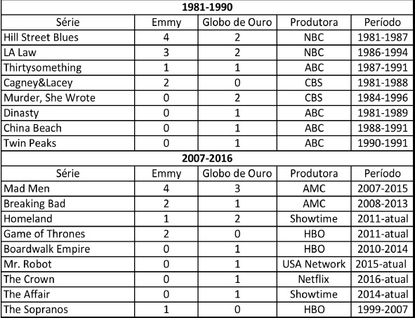 A comparação entre as séries televisivas de alcance global mais aclamadas nos anos 1980 e no período entre 2007 e 2016 (Quadro 1) dá a medida das transformações ocorridas em cerca de três décadas no formato, conteúdo e processos de criação, produção e consumo das narrativas dramáticas desenvolvidas para a TV, e ajuda a compreender o que estudiosos e críticos, como Mittell (2012, 2015), Kallas (2016) e Leslie (2017), têm classificado como a nova era de ouro da televisão, um período caracterizado por investimentos e demanda por formatos e conteúdos narrativos não convencionais e capitaneado pelas produções das emissoras de TV por assinatura (pay TV) e streaming.