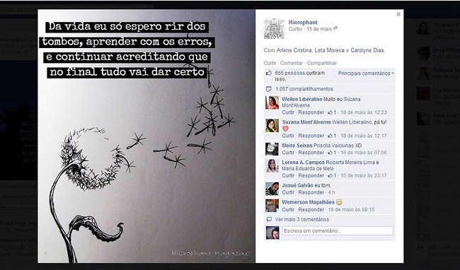 Destacamos o material colhido na fan-page intitulada Hierophant. O post apresenta o número de 1.057 compartilhamentos e 665 curtidas. É composta pela formulação linguística: “Da vida eu só espero rir dos tombos, aprender com os erros, e continuar acreditando que no final tudo vai dar certo”. Associada ao texto, vemos a imagem de uma flor que libera suas frágeis pétalas ao vento.