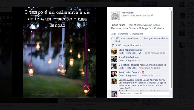 No post, temos a formulação linguística “O tempo é um calmante e um amigo, um remédio e uma Bênção” e, abaixo desta, a imagem de fundo apresenta luminárias artesanais com velas em um jardim. A postagem recebeu 995 curtidas e 1.313 compartilhamentos.