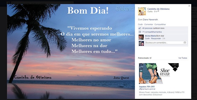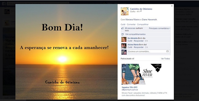 Os índices de compartilhamentos e curtidas não são tão expressivos quanto os da página Hierophant, porém apresentam a formulação “Bom dia!”, a qual é amplamente compartilhada em perfis pessoais da rede social em destaque. Esse cumprimento aparece quase sempre associado a imagens de plano de fundo com paisagens naturais, sejam com o nascer ou com o pôr do sol.