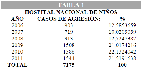 Es importante recordar que “la violencia es una construcción histórica que se modela y aprende, por lo tanto deben revisarse los mensajes que emiten los diferentes agentes socializadores que la refuerzan: la familia, el sistema educativo, los medios de comunicación, las iglesias, el sistema de salud, el sistema judicial y otros” (Ministerio de Salud, 2001: 12). Concretamente, en Costa Rica, el aumento de la agresión infantile cumple ya una década, de acuerdo al Ministerio de Salud y a la Organización Panamericana de la Salud (2004) era preocupación hace diez años el incremento en la cantidad de situaciones de agresión infantil, así como el crecimiento y la crueldad de las formas de maltrato. El aumento actual de la violencia intrafamiliar infantil en el país ha sido denunciado por varias fuentes periodísticas. Para fundamentar lo anterior, se elaboró la siguiente tabla, con base en los datos de la página web del Hospital Nacional de Niños (HNN):