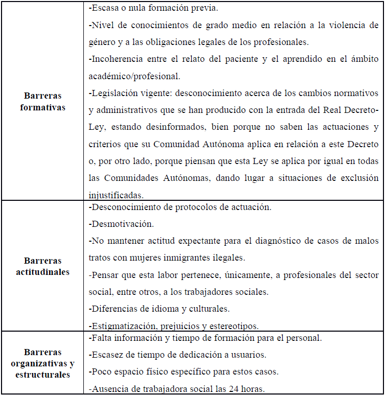 A estas dificultades a las que se enfrentan las mujeres para acceder a los recursos sanitarios públicos, hay que sumar las barreras creadas por parte de los profesionales en la atención a estas mujeres. El cuadro 1 recoge las barreras más importantes a las que se enfrentan los profesionales en la intervención son las siguientes.