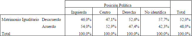 La variable “apoyo al matrimonio igualitario” intenta captar el grado de acuerdo de la ciudadanía con el matrimonio entre parejas homosexuales o personas del mismo sexo. La pregunta (P38C) se formula en el cuestionario del siguiente modo: “Nivel de acuerdo con que: las parejas homosexuales deberían tener derecho a contraer matrimonio. 1) Muy de Acuerdo; 2) De Acuerdo; 3) Desacuerdo; 4) Muy en Desacuerdo” [19]. Dicha pregunta fue recodificada como variable en: 1) Acuerdo; 2) Desacuerdo. Esta pregunta recodificada se utiliza para el análisis bivariado de la sección “Acuerdo con el Matrimonio Igualitario según Identificación Política en Chile 2014”.