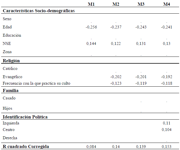 Para el análisis de Regresión Lineal Múltiple (RLM), la variable dependiente “Acuerdo con el Matrimonio Igualitario”, correspondiente a la pregunta (P38C), fue recodificada de menos a más: 1) Muy en Desacuerdo; 2) Desacuerdo; 3) Acuerdo; 4) Muy en Desacuerdo. Dado que utilizar una variable de 4 categorías como variable dependiente para la RLM, es decir, que esta no cuente con un valor “0” (ni de acuerdo/ni en desacuerdo), no es lo más ortodoxo desde el punto de vista del rigor de la técnica [20], testearemos los resultados obtenidos en la RLM con un Análisis de Regresión Logística Binaria. Para tal ejercicio recodificaremos la variable dependiente en valores 0 y 1 (variable dummy), donde el valor: 1) Acuerdo; 0) Desacuerdo.