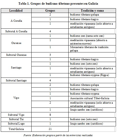El trabajo de campo se realizó con entrevistas semiestructuradas. La mayoría de grupos gallegos no cuentan con maestros residentes en la Comunidad Autónoma de modo permanente, a excepción de Guese Tenzin Tandin, lama (maestro) tibetano que acaba de construir un monasterio en Galicia para toda la Comunidad Gelupa de España [1]. Por ello, las entrevistas se llevaron a cabo con los coordinadores encargados de llevar el peso de la organización de eventos, tanto de culto semanal como las visitas de maestros, cursos y conferencias.1