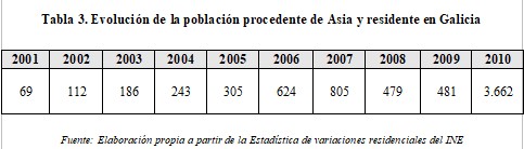 Si tenemos en cuenta que en los datos extraídos de entrevistas y recogidos en la tabla anterior el 90% de practicantes son de origen español y el otro 10% son occidentales, parece claro que no estamos considerando a las comunidades inmigrantes asiáticas en los datos proporcionados hasta el momento. Los asiáticos son una comunidad minoritaria en Galicia, pero, de haber sido tenida en cuenta, la cifra estimada hubiese vuelto a variar. La tabla siguiente recoge el número de inmigrantes de origen asiático llegados a Galicia en el primer decenio del 2000, período que coincide también con la apertura de numerosos centros a la Comunidad Autónoma.