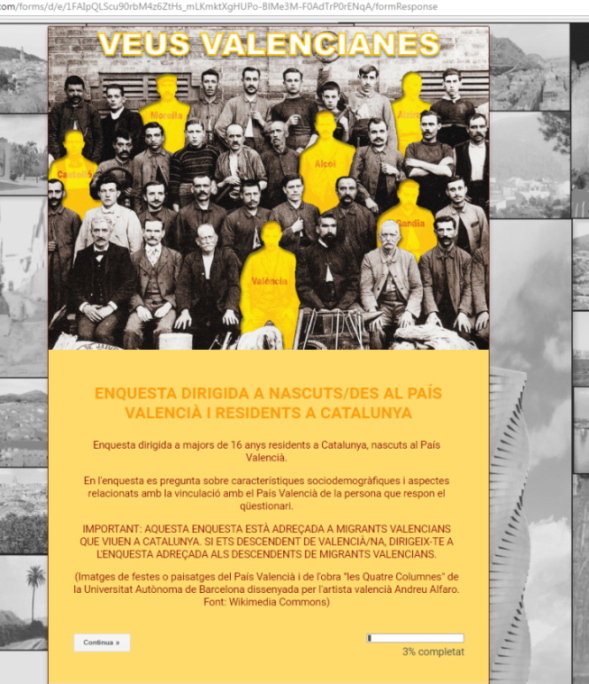 Las fuentes tradicionales, como el padrón, permiten saber que hay 61.657 valencianos registrados en Cataluña. Ahora bien, después de llevar a cabo las entrevistas en profundidad se constató que gran parte de los entrevistados no estaban empadronados en el lugar de residencia –o habían tardado en empadronarse– por diversos motivos, lo que también afecta a los contingentes de valencianos que residen actualmente. Igualmente, nos interesa conocer el destino de los descendientes de los más de 126 mil valencianos censados en 1930, cuando representaban el principal contingente de población migrante por delante de aragoneses (118 mil) y murcianos (81 mil) (Pujadas, 1982). El padrón o el censo nos permiten saber algunas características sociodemográficas básicas para el conjunto del colectivo y las entrevistas en profundidad las experiencias vitales de algunos de sus protagonistas o descendientes, mientras que la CC ofrece la posibilidad de adentrarnos en un camino intermedio entre el análisis cuantitativo y el cualitativo. Así, Veus Valencianes se pensó con el fin de abarcar más individuos de los que permiten las entrevistas en profundidad y obtener más información de la que proporciona el censo o el padrón.
